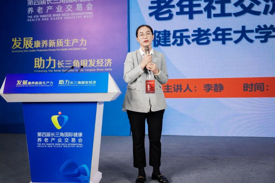 健乐老年大学校长李静发表《老年社交流量的运营解读》主题演讲,介绍了健乐老年大学创立历程,提出“学习是最好的养老”理念,帮助老年人培养兴趣,增加老年人的社会参与感。